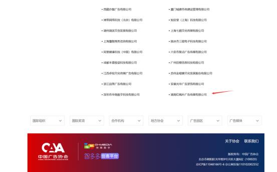 3月1日,經(jīng)中國廣告協(xié)會審核,國家高新技術(shù)企業(yè)湖南紅楓葉廣告?zhèn)髅接邢薰菊酵ㄟ^中國廣告協(xié)會資質(zhì)認(rèn)證,并獲得《中國廣告協(xié)會會員證書》,及中國廣告協(xié)會官方網(wǎng)站,會員單位名錄的收錄。