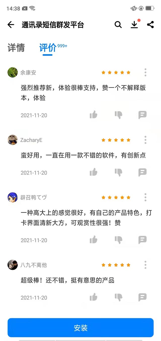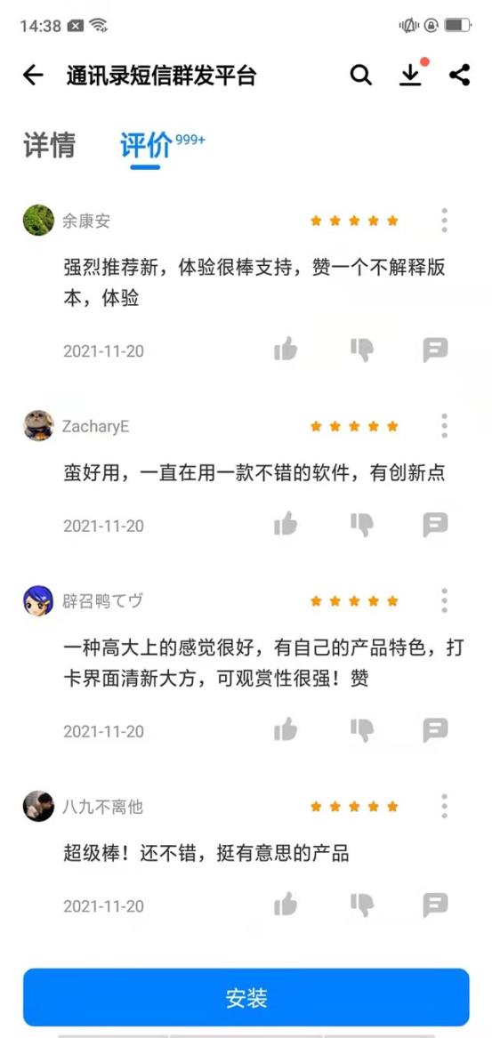 于是,我就在網(wǎng)上找了個(gè)通訊錄短信群發(fā)APP,紅楓葉傳媒研發(fā)的,輕松解決我的煩惱。這款軟件的特點(diǎn)就是夠可靠,各項(xiàng)資質(zhì)都齊全,再也不用擔(dān)心自己的賬號(hào)因?yàn)榘l(fā)信息太多而被封了~iOS和安卓系統(tǒng)都能用,不挑機(jī)型,在各大應(yīng)用商店就能很容易地下載到噢!而且這段時(shí)間下載免費(fèi)體驗(yàn),群發(fā)短信的套餐也炒雞便宜,不過一丟丟的成本,我就讓公司營業(yè)額翻了個(gè)倍,現(xiàn)在我的老大恨不得把我當(dāng)團(tuán)寵,看來升職加薪就在眼前!
